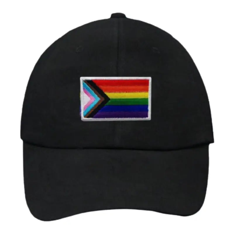 Flag baseball hats are black hats with an embroidered progress pride flag striped with the colors of the rainbow as well as black, brown, and transgender color chevron to be more inclusive.