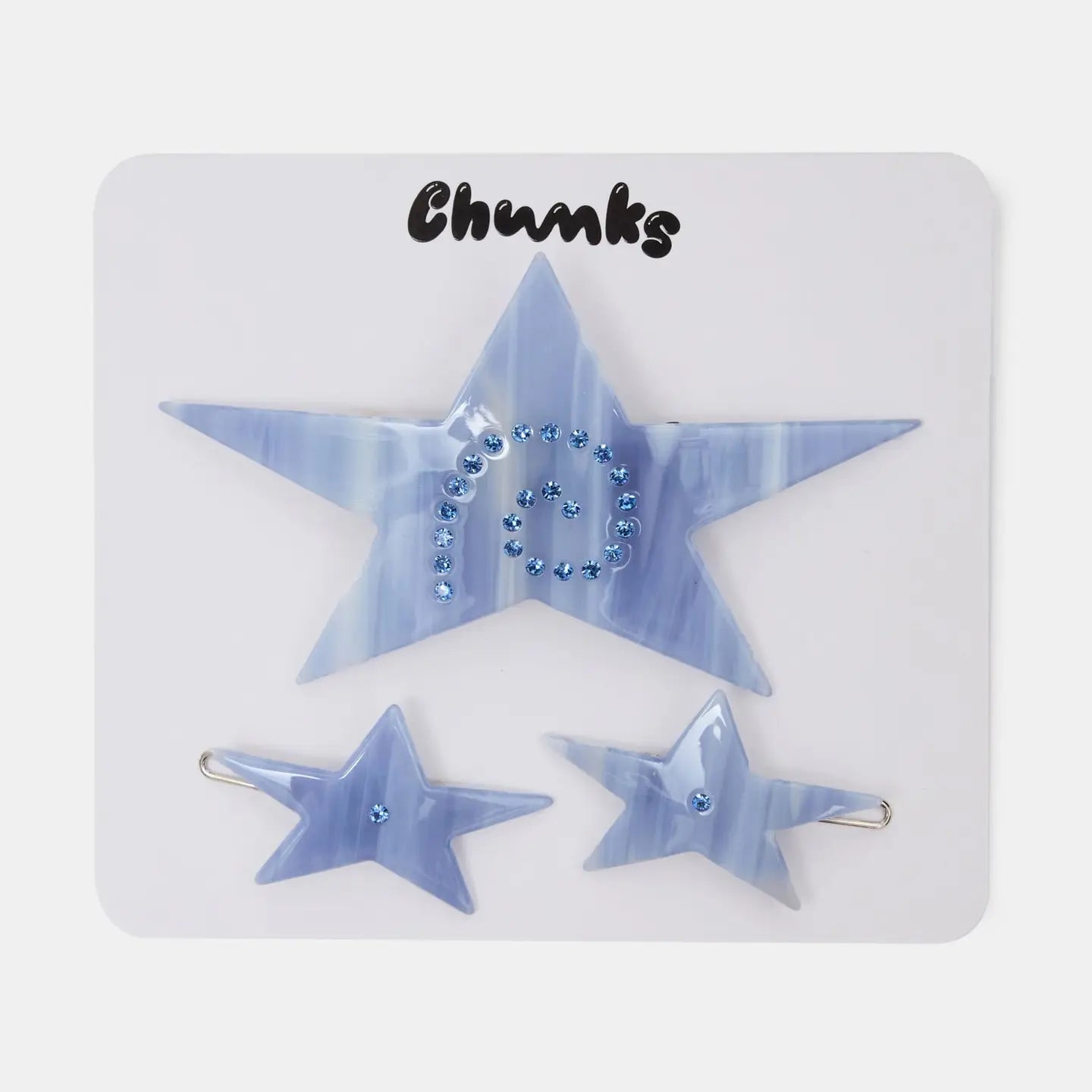 A 3 pack of denim blue colored star clips, studded with blue rhinestones. Two small ball-and-clasp clips and one large french barrette clip.