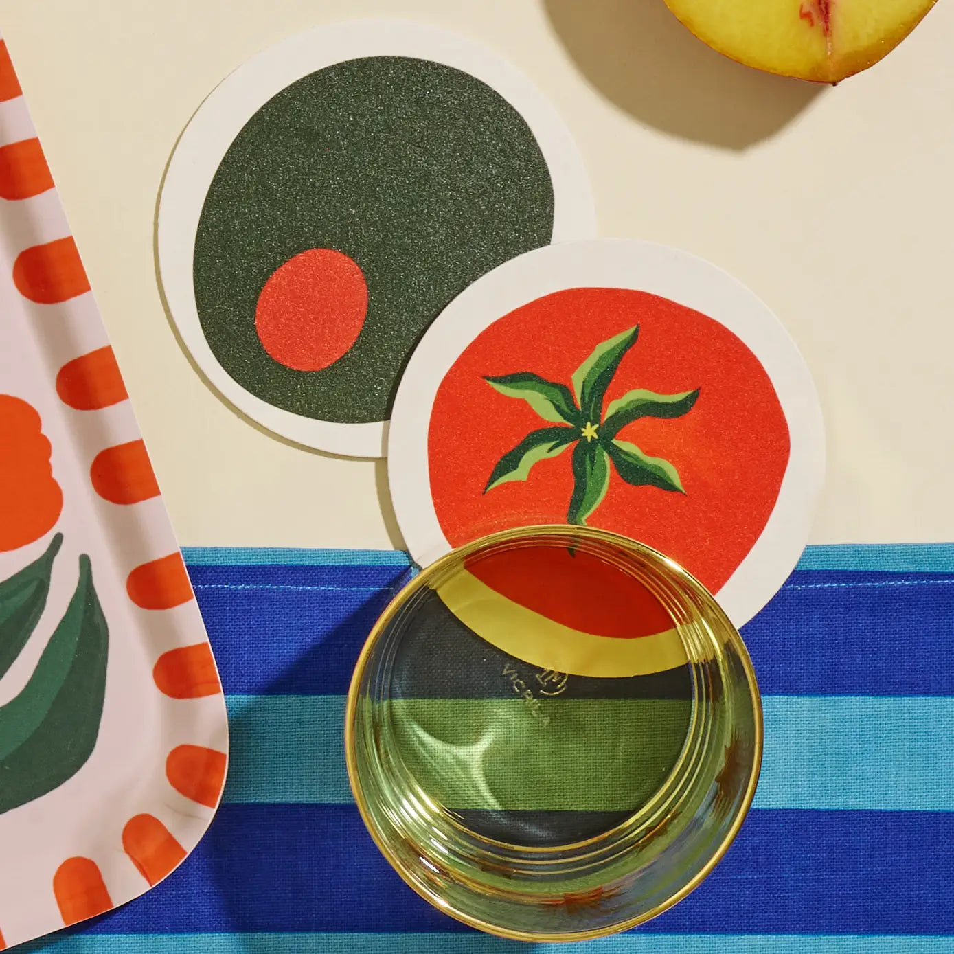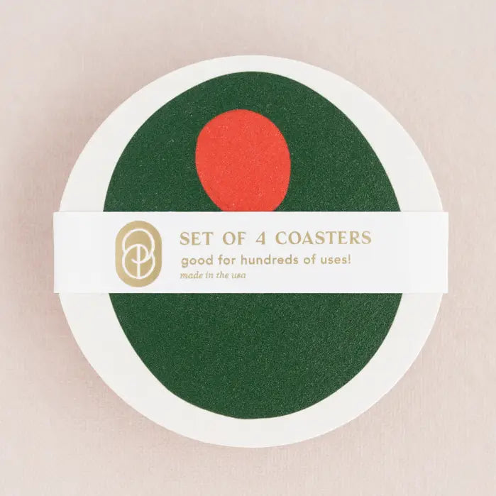Our coasters are comprised of wood pulp, made exclusively with shavings from sustainable forestry. They are printed with UV ink, and packaged with a foil-pressed belly band made of recycled cotton paper.