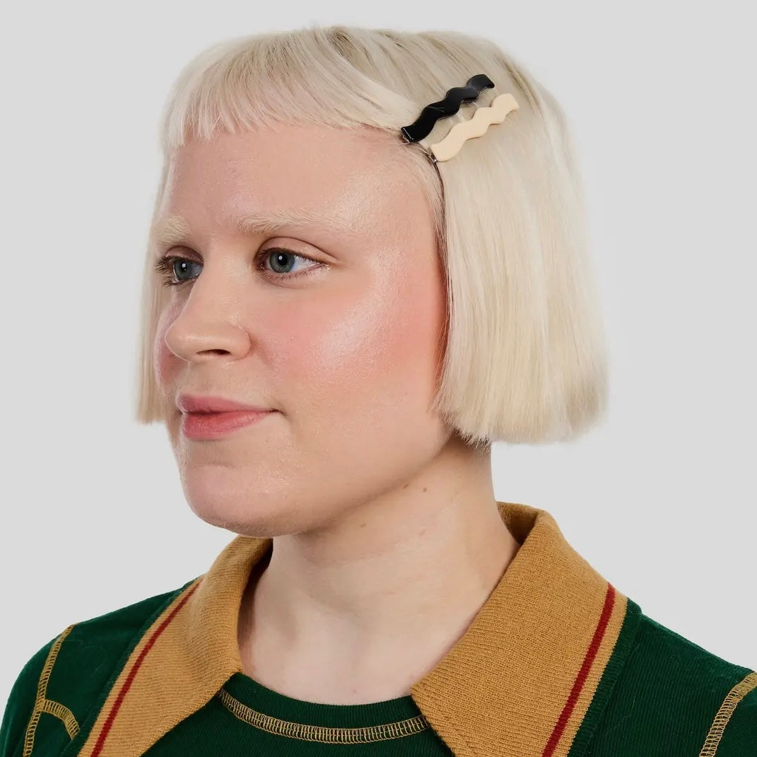 These slide-style barrettes have no clasp. Just pry them open a bit and slide them on for a pop of color. Perfect for taming bangs and flyaways. Made from high quality acetate; a durable, plant based bio-plastic.