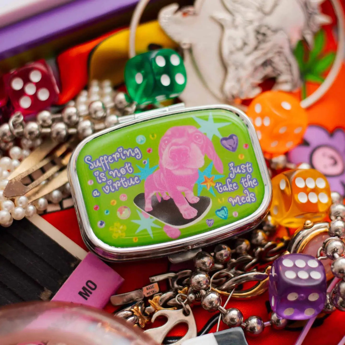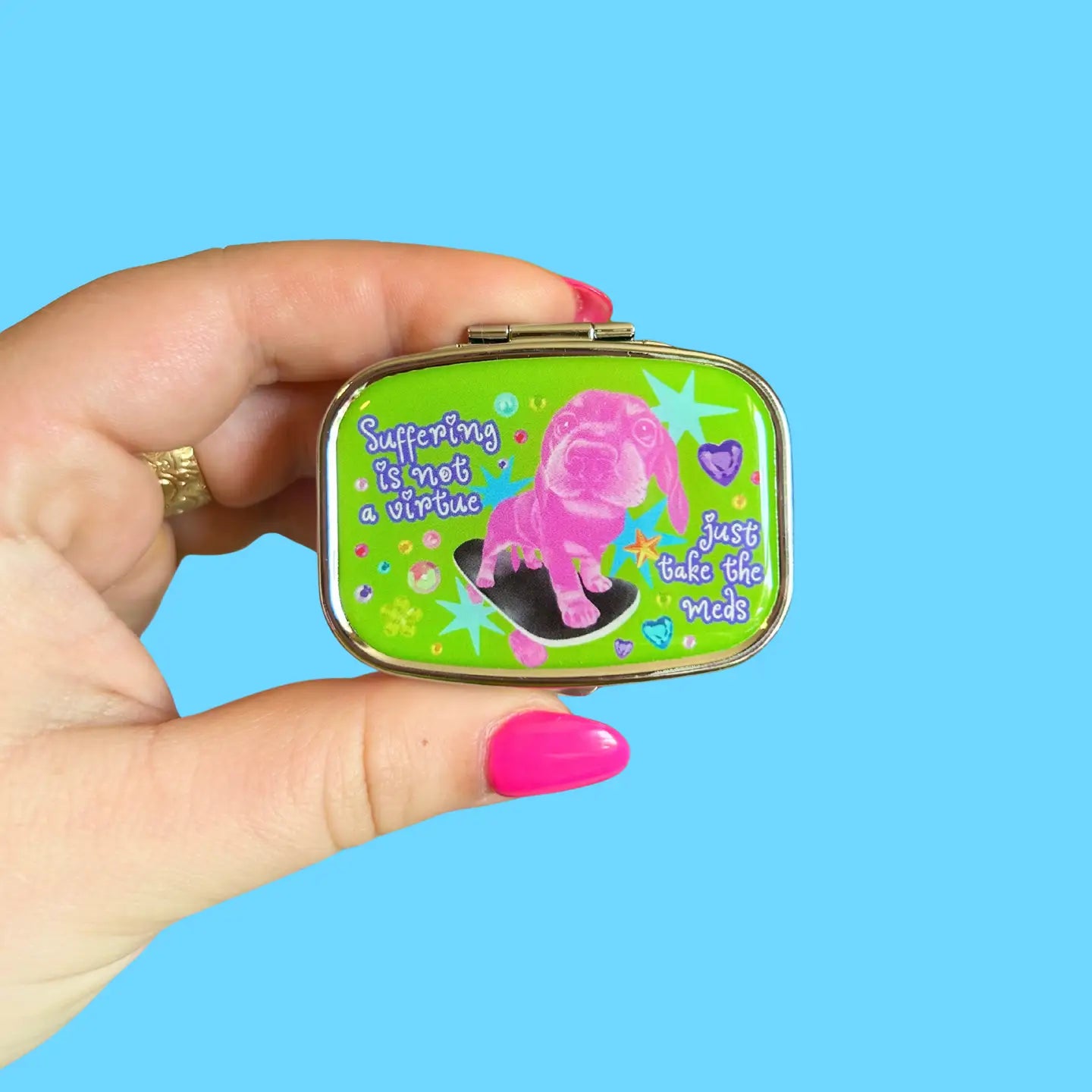 Never be without your meds again! This portable pill container is perfect for bringing your lactaid and ibuprofen with you wherever you go! It has a secure closure to prevent spills, a divided internal space to keep things organized, and even has a mirror in the lid!