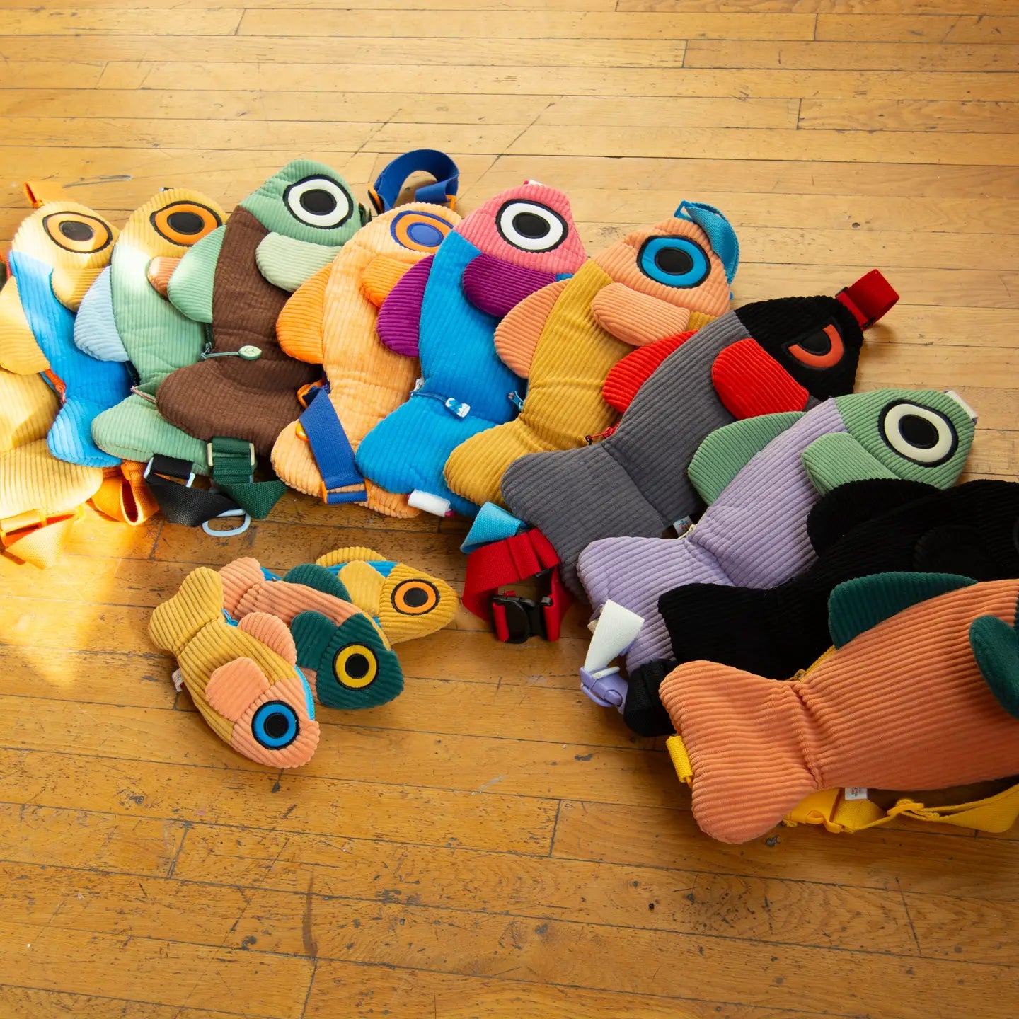 He can be worn as a crossbody or a (large) fanny pack.He can be worn as a crossbody or a (large) fanny pack. The interior is lined with a durable printed mac n' cheese patterned cotton. The large main pocket extends the entire length of the fish and is big enough for a standard sized water bottle, Nintendo Switch, or small journal.