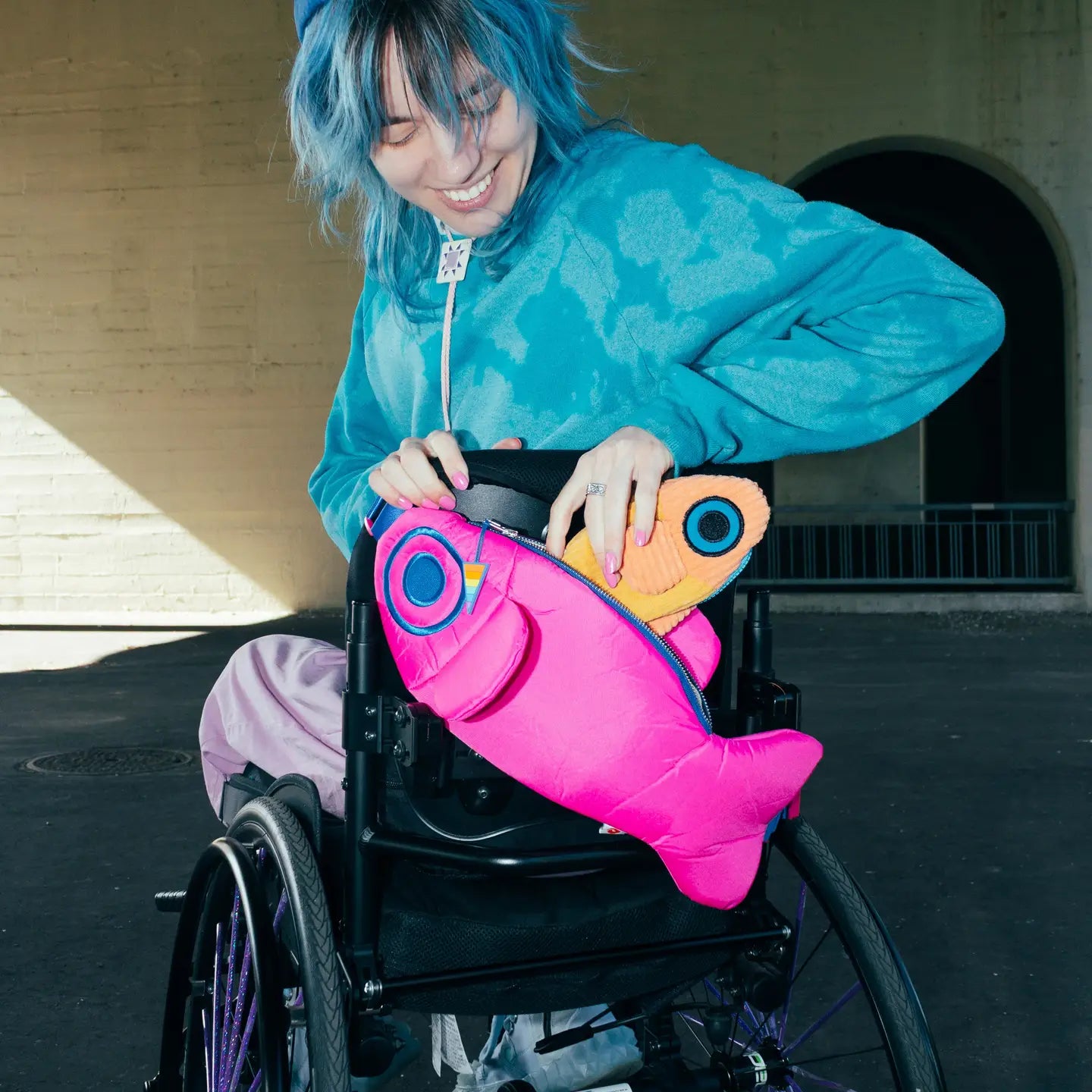 He can be worn as a crossbody or a (large) fanny pack. The interior is lined with a durable cream-colored cotton canvas tastefully flecked with multicolored 'funfetti sprinkles'. The large main pocket extends the entire length of the fish and is big enough for a standard sized water bottle, Nintendo Switch, or small journal.