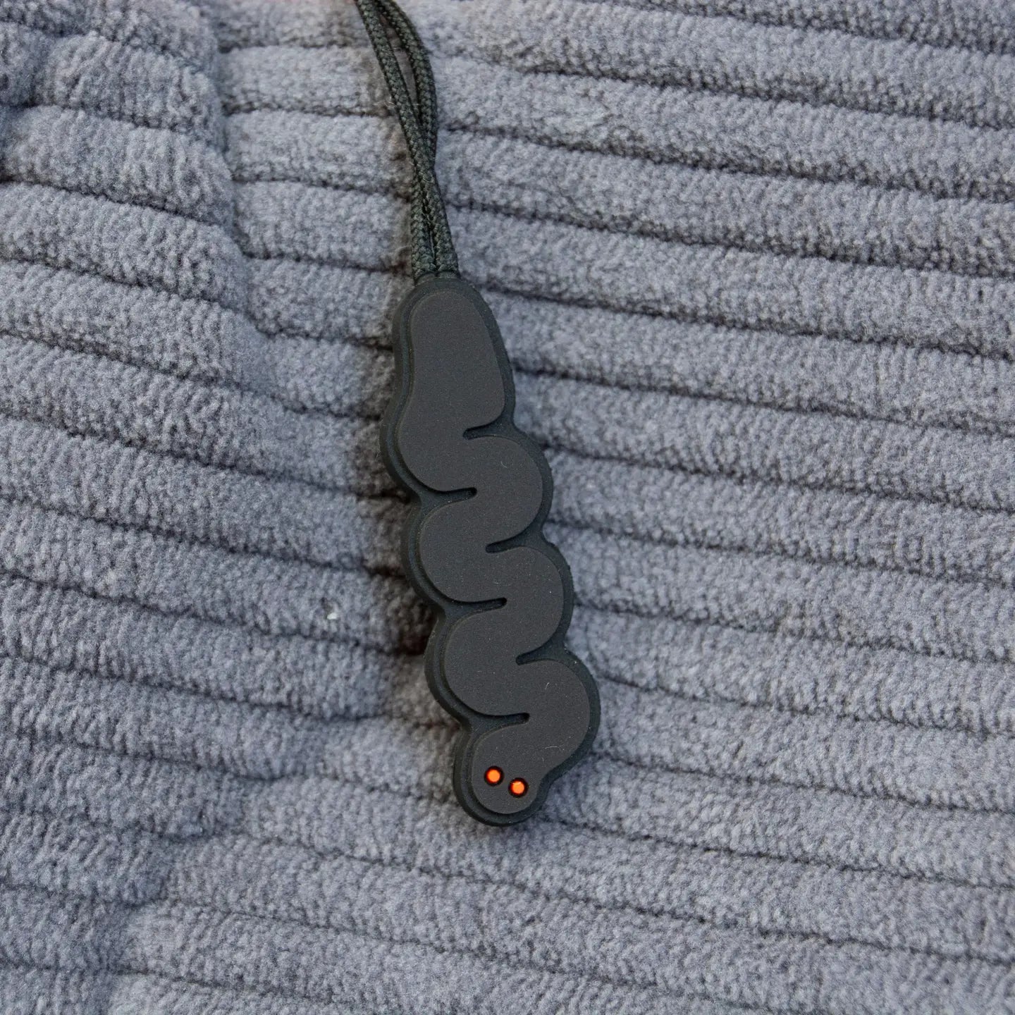 He's 17" x 6.75" and comes with a fruity little rubber worm zipper pull, D-ring and buckle matched to the adjustable 1.5" wide cotton strap, and can be adjusted to be between ~36" - 80" long (91cm x 203cm) (including the length of the bag) with the included strap-extender.