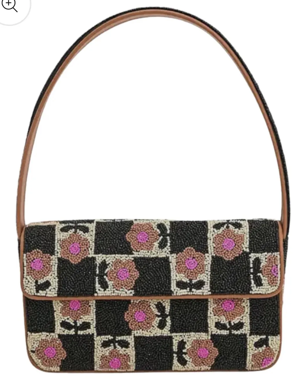 Featuring a bold black-and-beige checkered pattern accented with delicate pink floral details, this shoulder bag perfectly balances classic charm with playful flair. The flap closure with dual magnetic snaps keeps your essentials secure, while brown PU binding adds a polished finish. Inside, a black satin lining with a zipper pocket keeps belongings neatly organized, and the back open pocket provides easy access to quick-grab essentials.