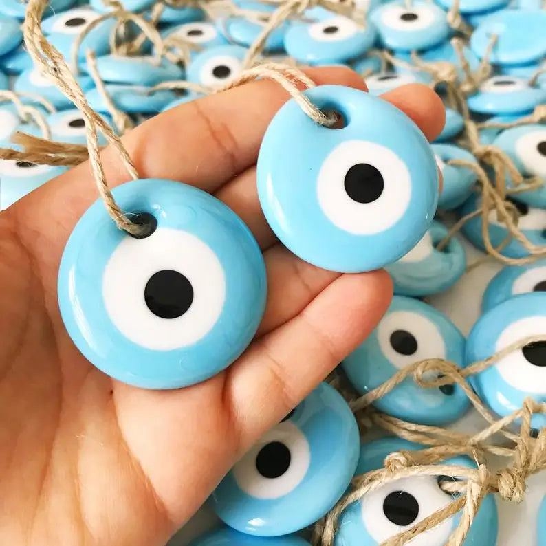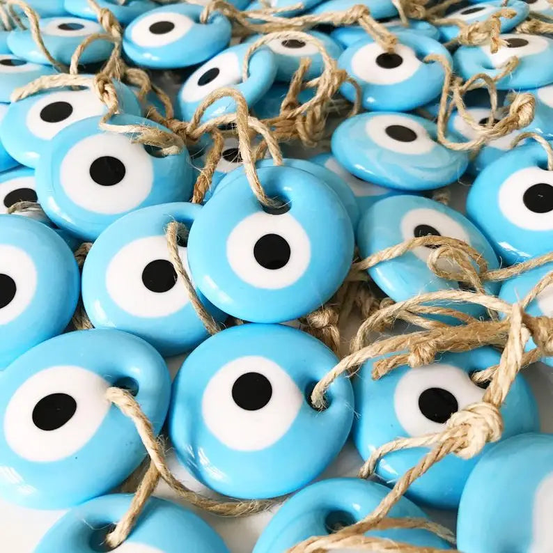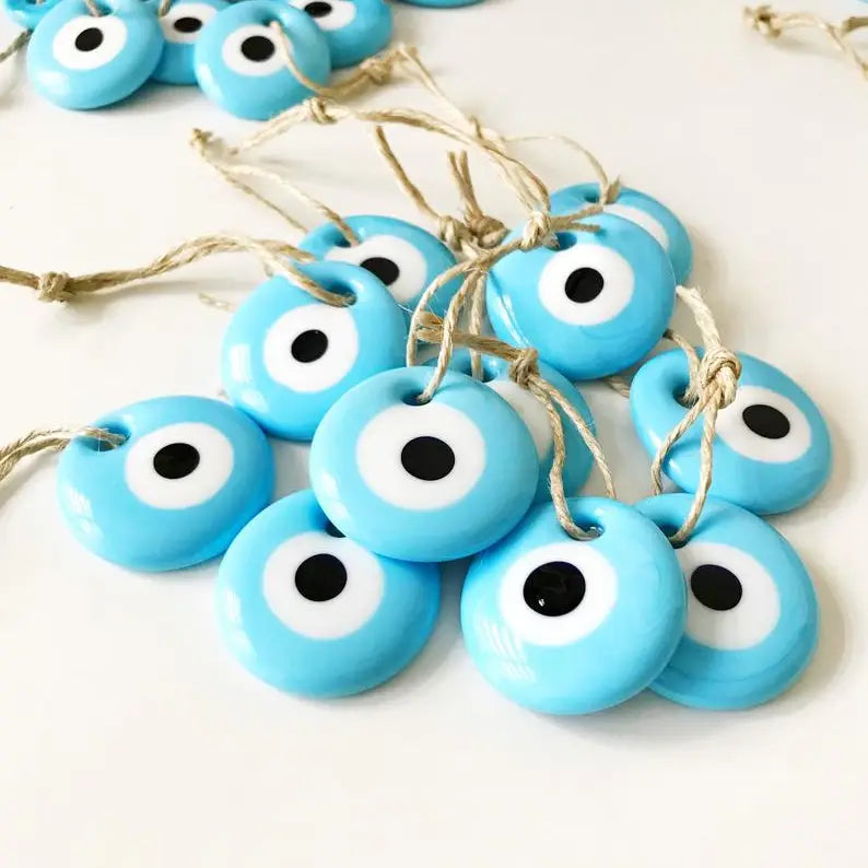 Handmade glass turquoise evil eye bead with card, made in Santorini by Evileyefavor.